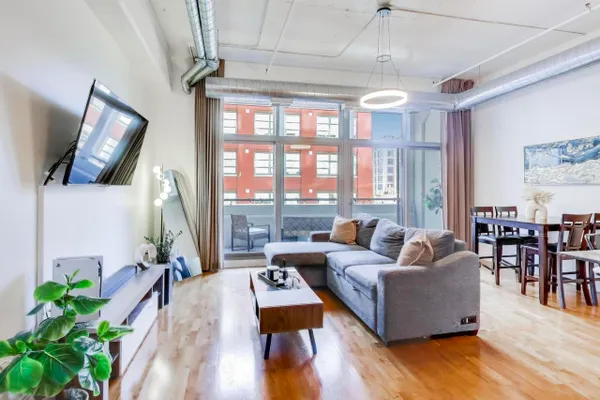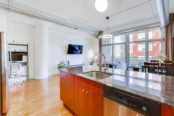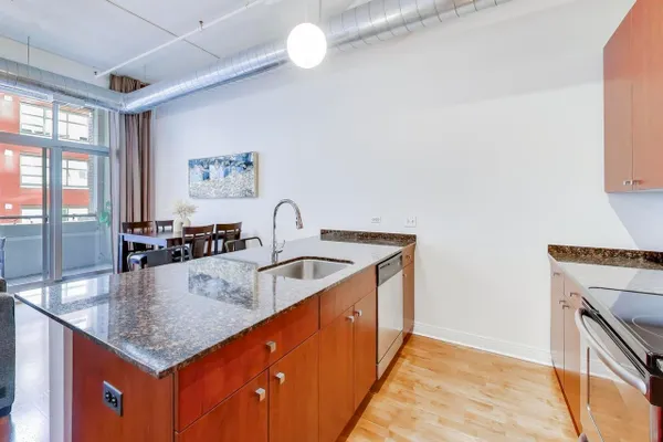 Prime West Loop two bedroom, two bath loft style condo. Bright and pristine, this home is filled with natural light from floor to ceiling windows and sleek hardwood flooring. A thoughtfully designed layout connects the living, dining, and kitchen areas, opening to a covered, balcony ideal for morning coffee or evening relaxation. The kitchen is well appointed with an island with seating and stainless steel appliances, creating a functional and inviting space for both daily living and entertaining. Two spacious bedrooms, highlighted by a primary suite with en suite bath. An in unit washer and dryer adds everyday convenience. A rare verstile/flex room (H) located across the hall provides valuable additional space, ideal for a private office, creative retreat, or storage. Residents enjoy full service amenities including 24 hour door staff, an expansive resident lounge with a full kitchen and bowling alley, fitness center, movie theater, and an eighth floor roof deck. Ideally located on a quiet side street with easy access to downtown, Metra, CTA, expressways, and dining.